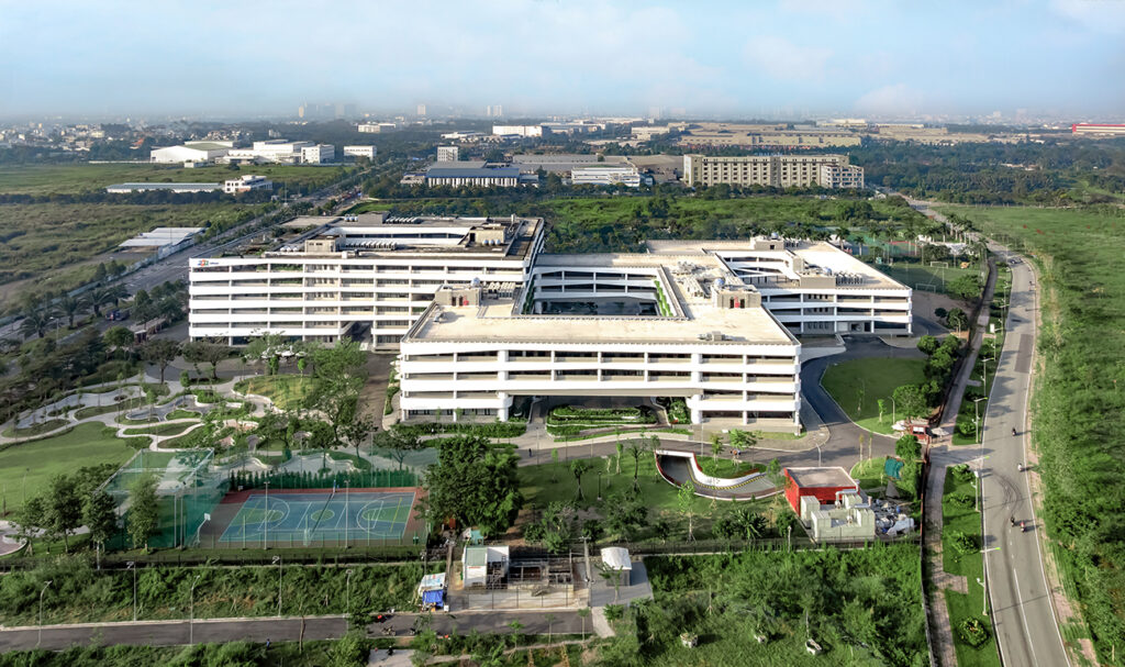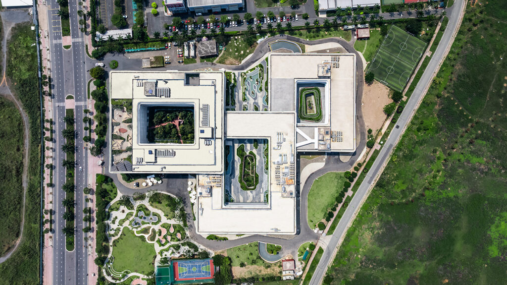 Landscape elements such as; fencing, signage, and parapet walls around the yard are made from red Corten Steel. The building’s use of colour and material sets it apart from other developments within the vast masterplan. Marked by the high contrast between the mono chromatic skin of the building that is in light, medium and dark grey, and the stunning lush vegetation the building is iconic.