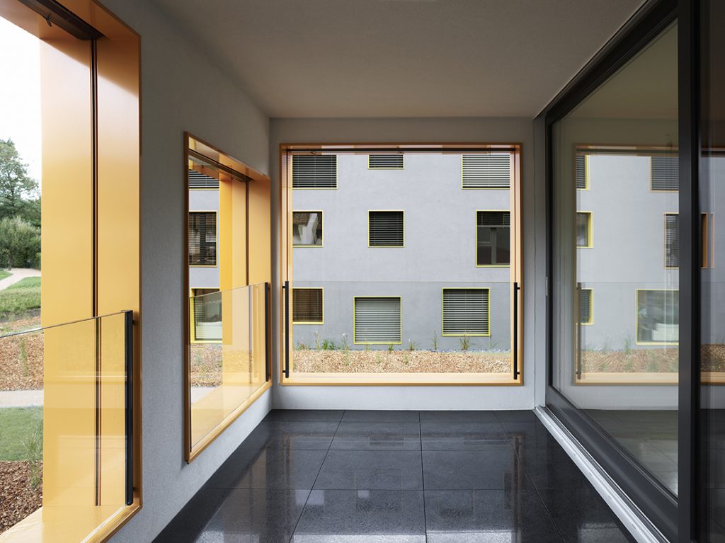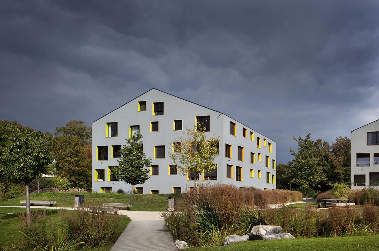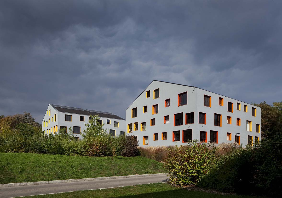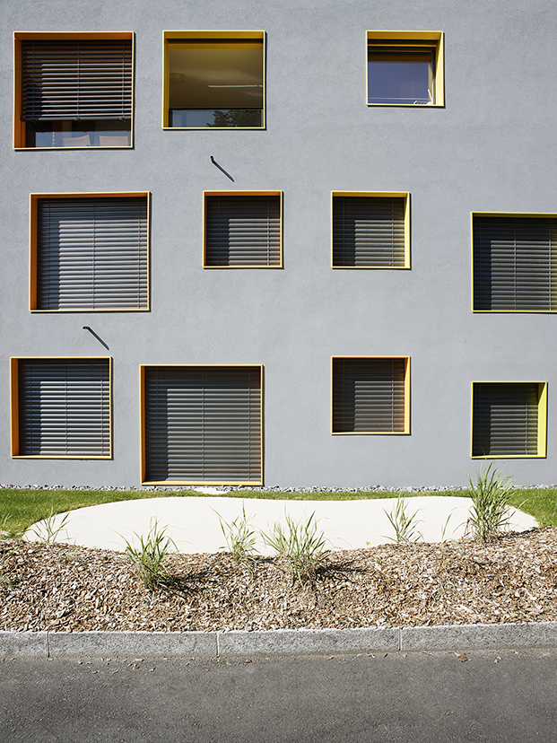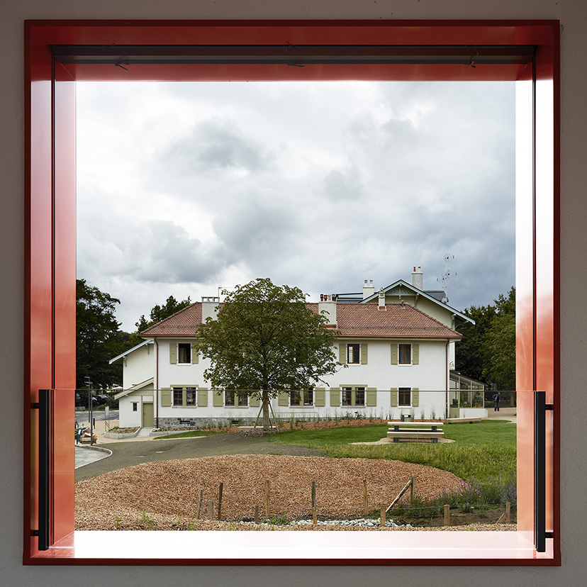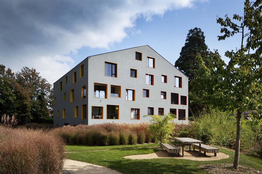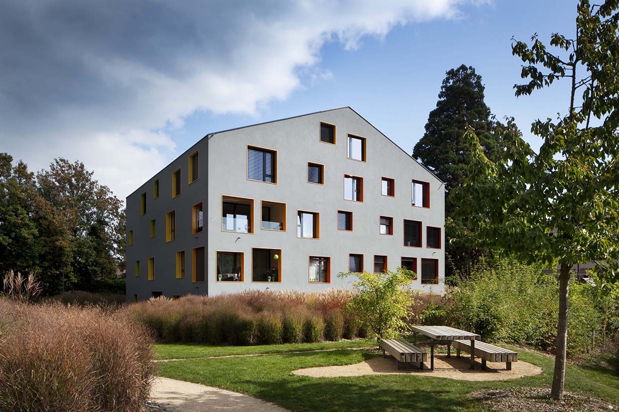 The pitch roof and massing reflect the shape of the village houses of the Geneva countryside. The facade openings vary in density and colour according to orientation, the different sizes and positions offer a variety of views from the height of the horizon down to the park.
