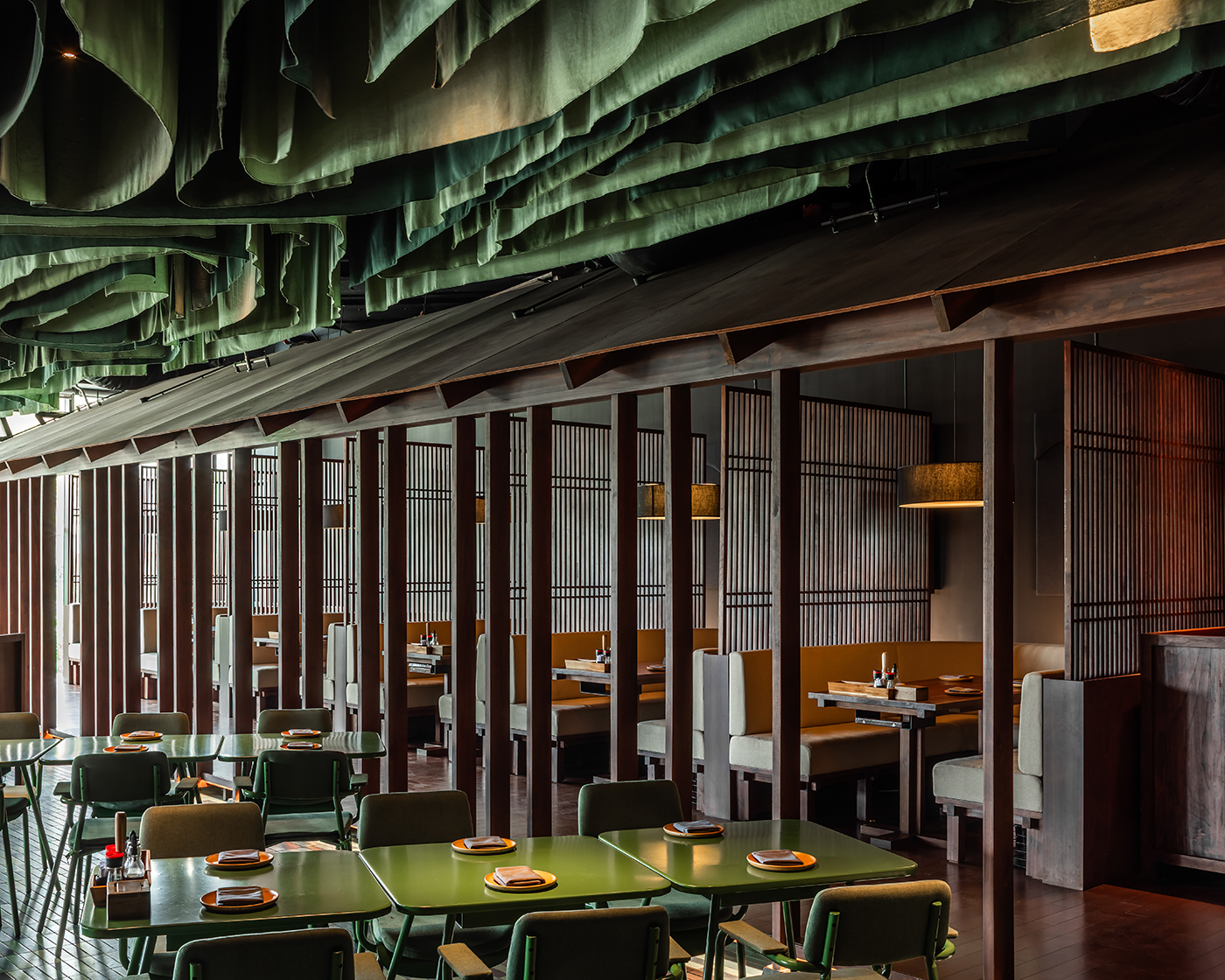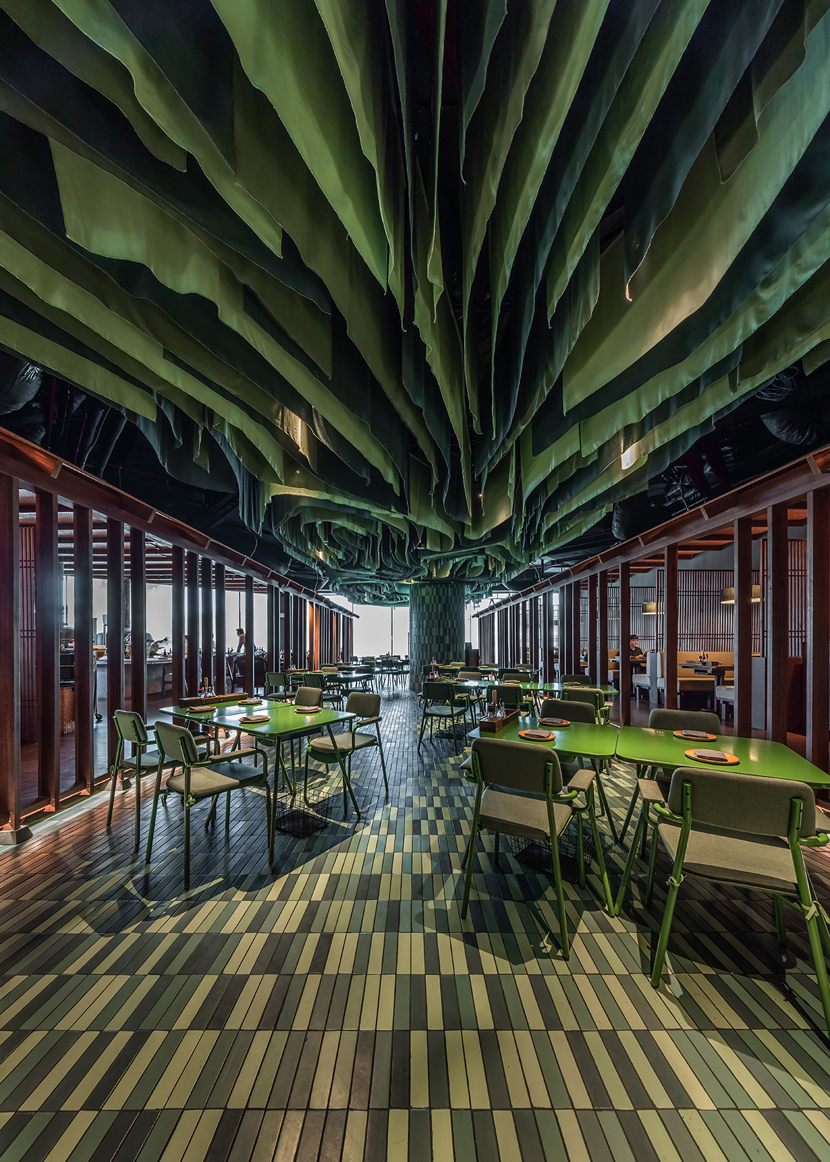 At the heart of the restaurant lies a verdant oasis, where lush green tiles and furnishings create a serene haven. Suspended from the ceiling, delicate green fabrics trace sinuous curves, infusing the space with an ethereal botanical allure.