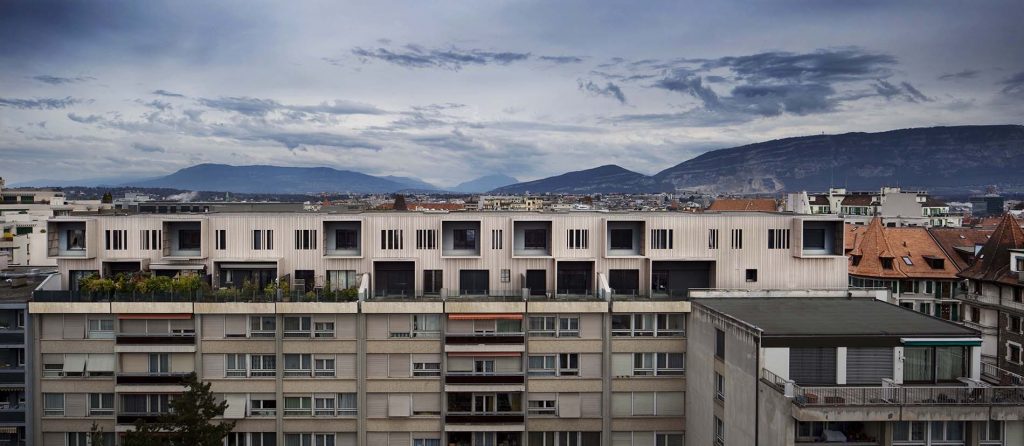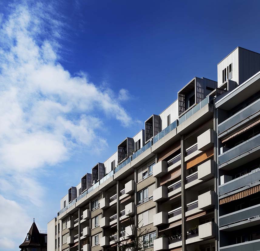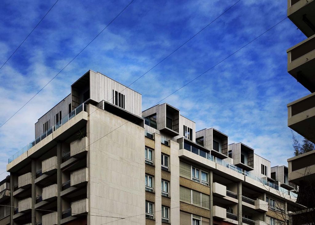 The aim of the intervention is to create a « suspended structure » made of wood that will clearly be distinguishable from the existent mineral construction. This structure covers up the existing attic in order to maintain the unity of the top of the edifice. The new dwellings that will benefit from the loggias will